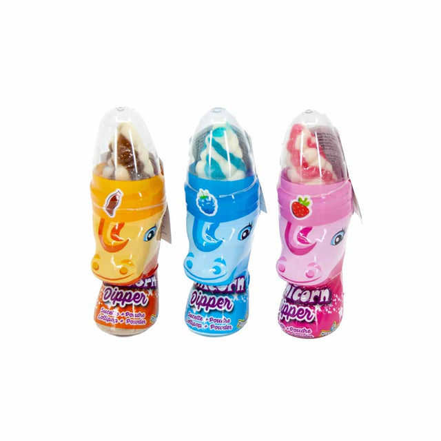 Zweifarbiger, gedrehter Lolli, der in ein saures Pulver getaucht wird. Der Lolli repräsentiert das Horn eines Einhornes! Lass Dich überraschen, welche der drei Geschmacksrichtungen du erhältst. (Cola, Himbeere oder Erdbeere)