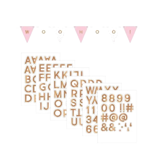 Mit diesem Wimpel-Banner-Set in Roségold und Rosa kannst du ein individuelles Banner für jede Party gestalten. Platziere die roségoldenen Buchstaben und Zahlen auf den mitgelieferten rosa und weissen Wimpeln, für eine passende Botschaft zu jeder Party.